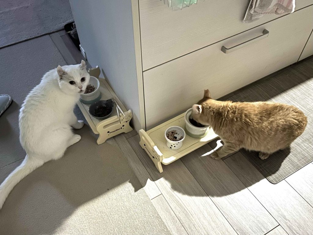 3人での「ご飯タイム」は「フィーバー🎉」です^^福は落ちつかずにウロウロ、カイトは福の足元で転がってクネクネ〜。2人が「カリカリもしゃもしゃ!」と夢中で食べる様子を、眺めお尻を触りながらお茶を飲むのが私のフィーバータイム🫶そうこうしていたら、カイトは全身を触らせてくれるようになりナデナデのおねだりもしてくれるようになりました!2人とも、毎日ありがとう!