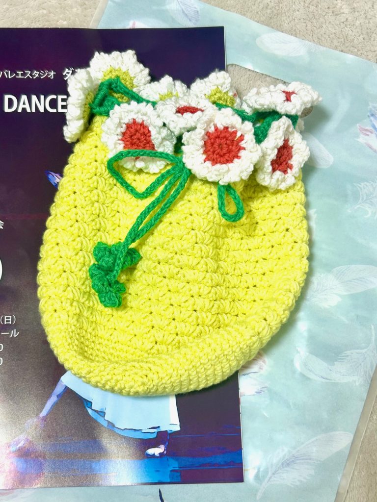 ホワイエでポーズ写真をセッティングしていたら、なんと先生お手製の手編みのバッグをくださいました!
